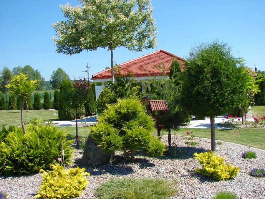 Entdecken Sie diese einmalige Immobilie in der idyllischen Lage von Dobra bei Stettin – eingebettet in ein wunderschön angelegtes Grundstück von beeindruckenden 3.500 m². Hier erwartet Sie ein freistehendes, ebenerdiges Einfamilienhaus mit stilvoller Ausstattung und durchdachter Architektur, ergänzt um ein separates Garagengebäude mit Platz für drei Autos und einer Fläche von ca. 70 m².