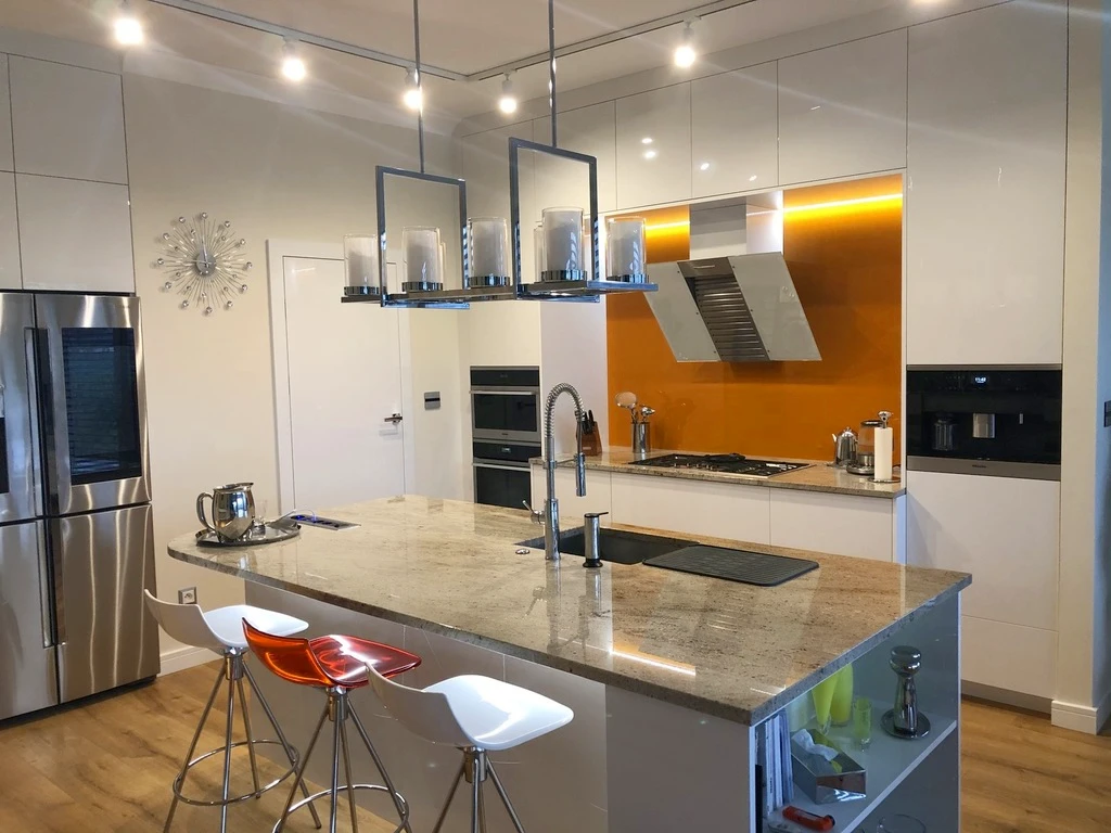 - Offene, maßgefertigte Küche mit Hochglanzfronten, granitener Arbeitsplatte und Griffsystem Blum