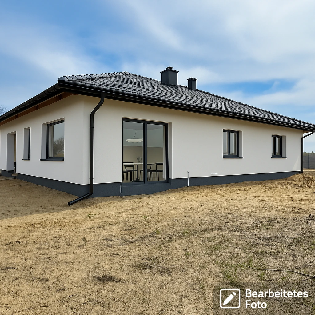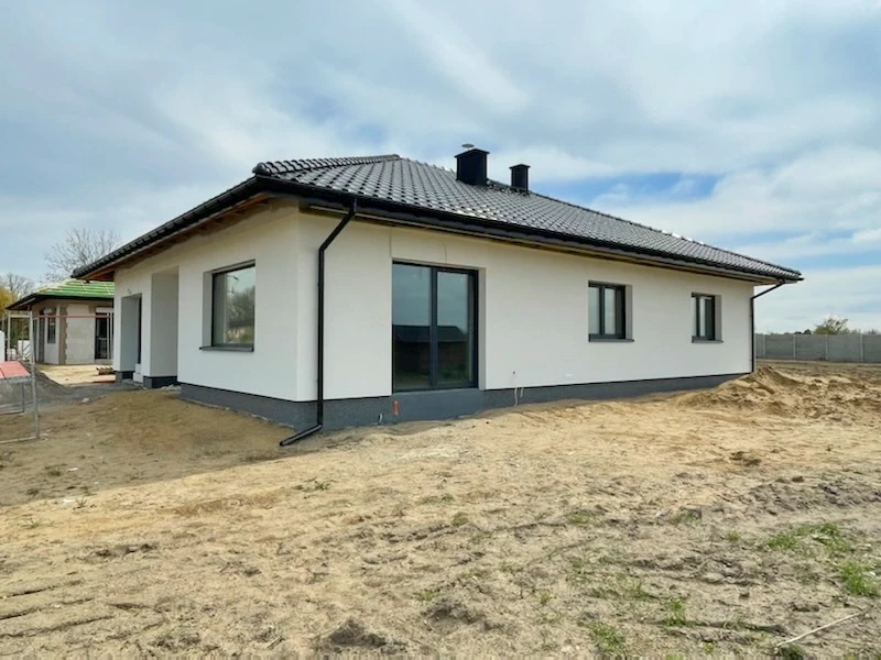 Dieses neu errichtete, eingeschossige Einfamilienhaus in Bobolin bietet eine Nutzfläche von 142 m² und eine bebaute Fläche von 179,52 m². Die Immobilie überzeugt durch ein klassisches Design mit modernen Akzenten: helle Fassade mit Steinoptik und kontrastierende dunkle Fensterrahmen verleihen dem Haus besonderen Charakter.