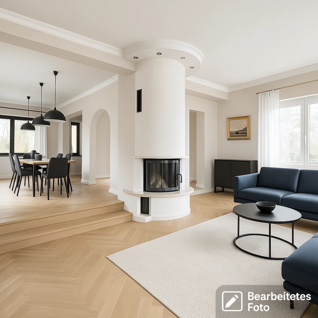 - Heller Wohnbereich mit Kamin, Esszimmer und offener Küche