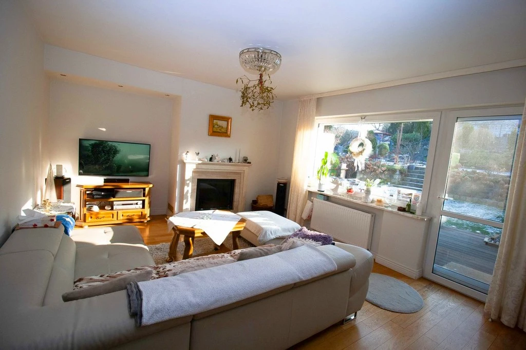 - Großzügiges Wohnzimmer (29 m²) mit Kamin und Zugang zur Sonnenterrasse (Südseite)