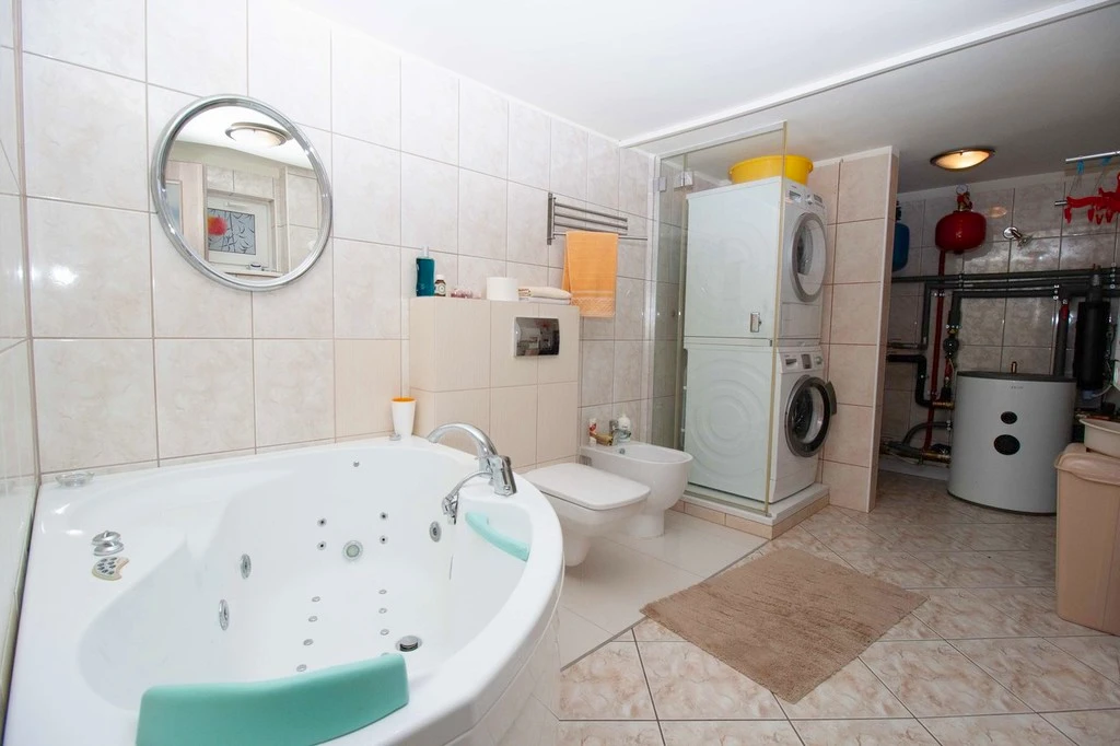 Badezimmerausstattung: WC, Bidet, Waschmaschine, Fenster, Wanne, Dusche, Trockner