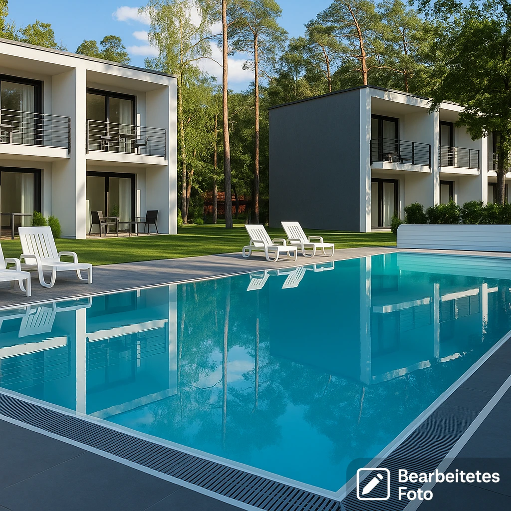 Die Anlage befindet sich auf einem geschlossenen, eingezäunten und videoüberwachten Grundstück. Das Apartment liegt in einem Segment direkt am beheizten Außenpool – perfekt für entspannte Sommertage.