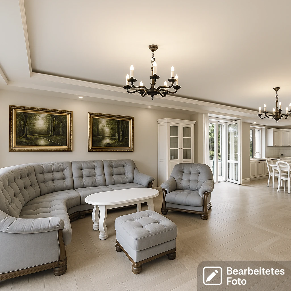 - Heller, großzügiger Wohnbereich mit offener Küche und direktem Zugang zur überdachten Terrasse (ca. 80 m²) – ideal für gesellige Stunden im Freien