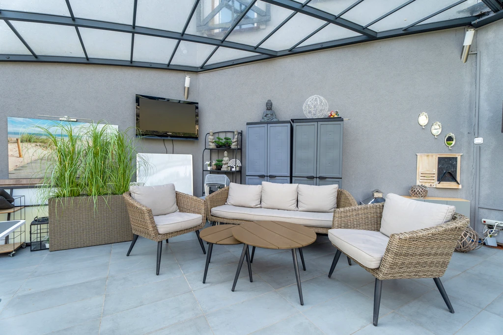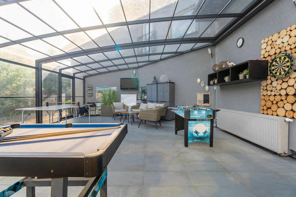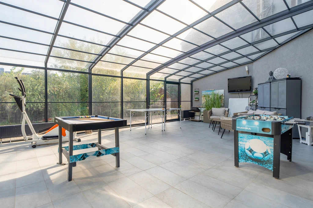 Das Haupthaus beherbergt insgesamt 15 vollständig ausgestattete Apartments mit eigener Küchenzeile und Badezimmer – ideal für Familien, Reisegruppen oder Paare. Der angrenzende große Wintergarten bietet zusätzlichen Raum für Entspannung oder gemeinschaftliche Aktivitäten.