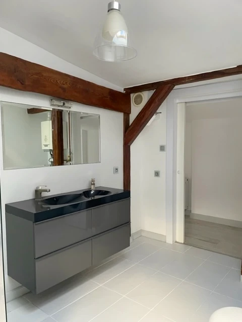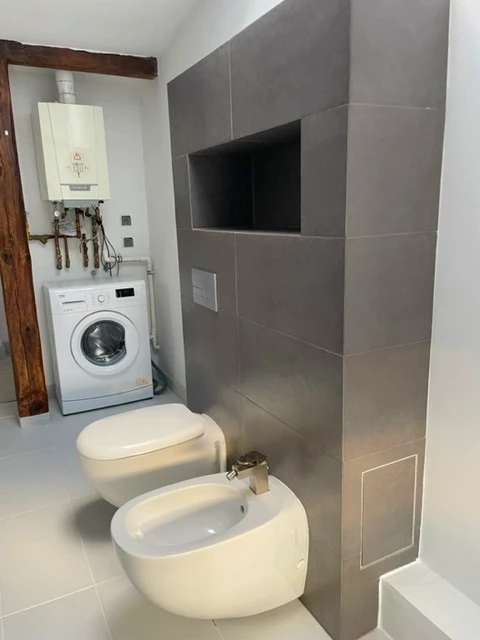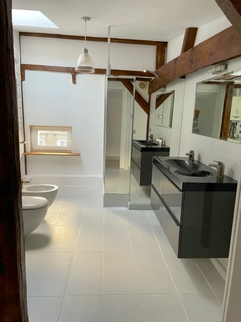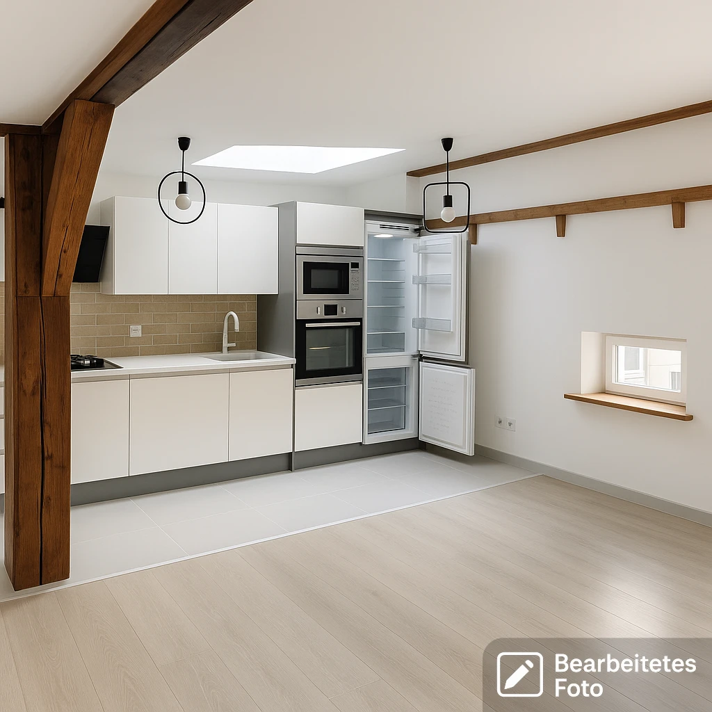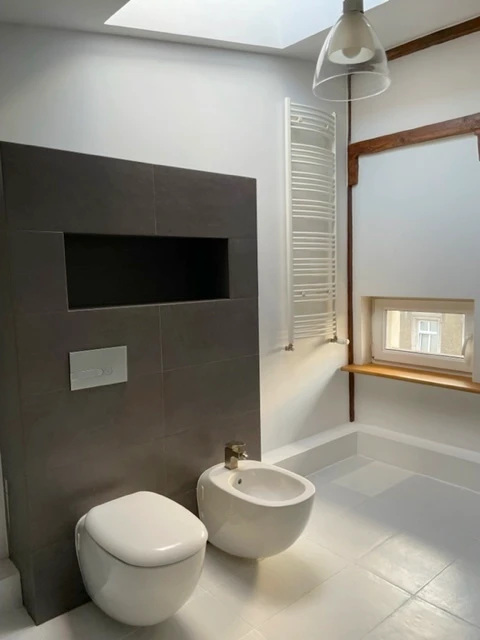 Die Bäder wurden in zeitgemäßem Design mit hochwertigen Armaturen und Duschkabinen ausgestattet. Die Wohnung besticht durch stilvolle Details: glatte Wände, moderne Bodenbeläge (Laminat), teilverglaste Dachflächenfenster sowie renovierte, sichtbare Holzbalken, die dem Raum Charakter und Wärme verleihen.