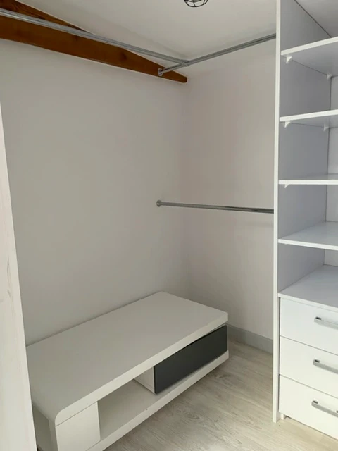Zwei der Schlafzimmer verfügen über großzügige begehbare Kleiderschränke, die durch klassische Flügeltüren betreten werden. Die offene Küche ist mit eingebauten Möbeln ausgestattet und harmonisch in den Wohn- und Essbereich integriert – ideal für geselliges Beisammensein oder entspanntes Wohnen.