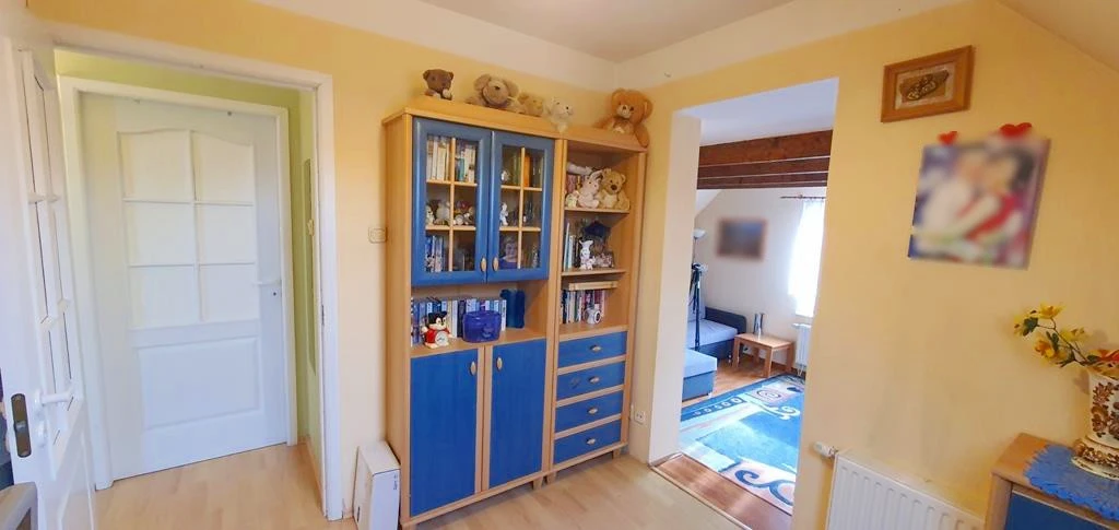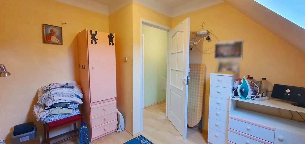 Obergeschoss: - Drei Schlafzimmer, darunter ein großzügiges Zimmer bestehend aus einem Wohnbereich mit Sofa und TV sowie einem anschließenden Arbeitsbereich. - Badezimmer mit Badewanne, Toilette und Waschmaschine. - Begehbarer Kleiderschrank. - Teilweise überdachte Terrasse mit Zugang aus dem Obergeschoss. - Vom Wohnzimmer im Obergeschoss führt eine Treppe zu einem ausgebauten Dachboden mit zusätzlichem Schlafbereich.