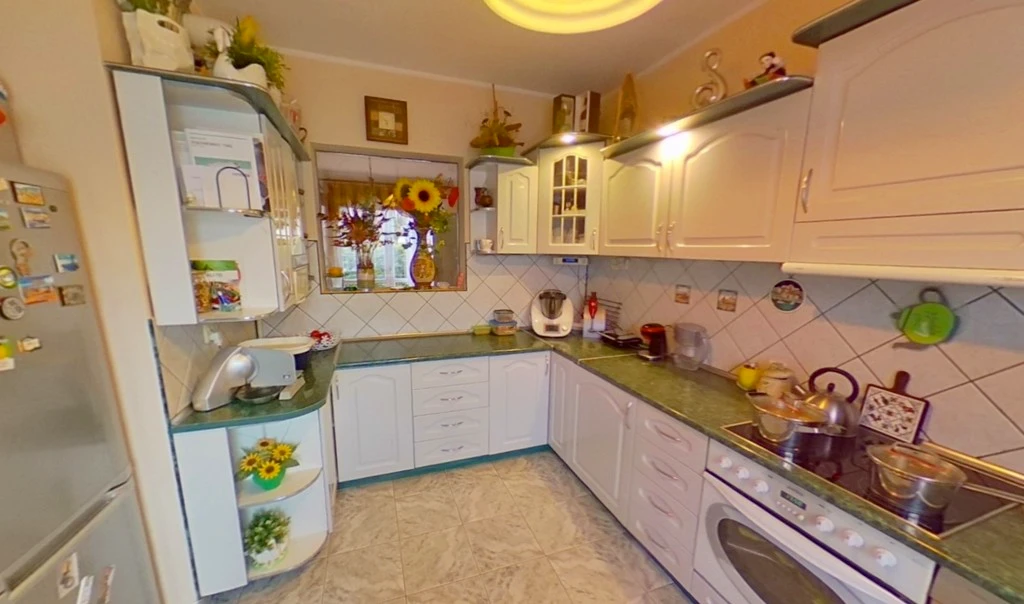 Erdgeschoss: - Heller, geräumiger Wohnbereich mit Essplatz, Zugang zum Garten sowie zur überdachten Terrasse im Stil eines Wintergartens – perfekt für gemütliche Stunden zu jeder Jahreszeit. - Separate Küche mit Fenster (10,6 m²), ausgestattet mit Elektroherd, Spüle, Einbaumöbeln, Kühlschrank mit Gefrierfach, Geschirrspüler und zusätzlicher Speisekammer. - Schlafzimmer mit Zugang vom Wohnzimmer. - Badezimmer mit Dusche, WC und Waschbecken. - Eingangsbereich mit praktischem Einbauschrank.