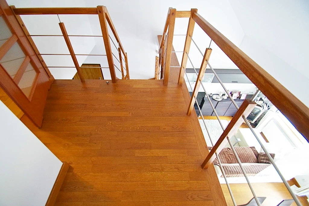 Die Holztreppe mit offener Struktur verbindet elegant beide Etagen und fügt sich stilvoll in das Wohnkonzept ein.