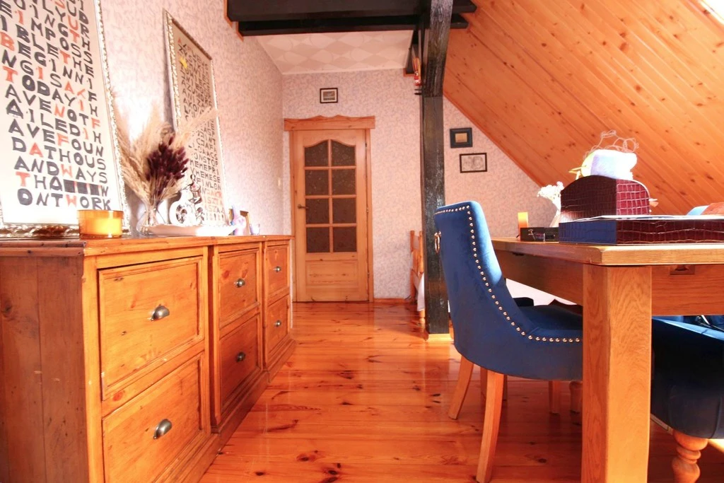- Wohnzimmer – von hier führt eine Holztreppe ins Dachgeschoss