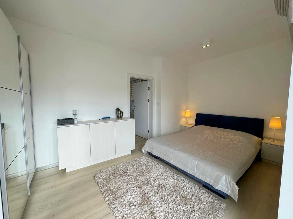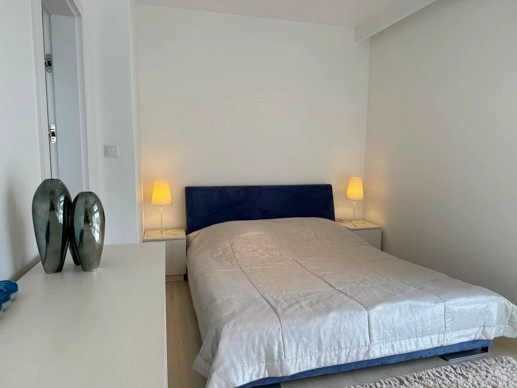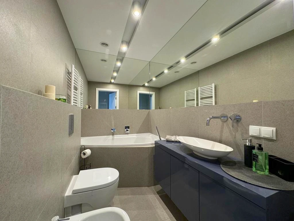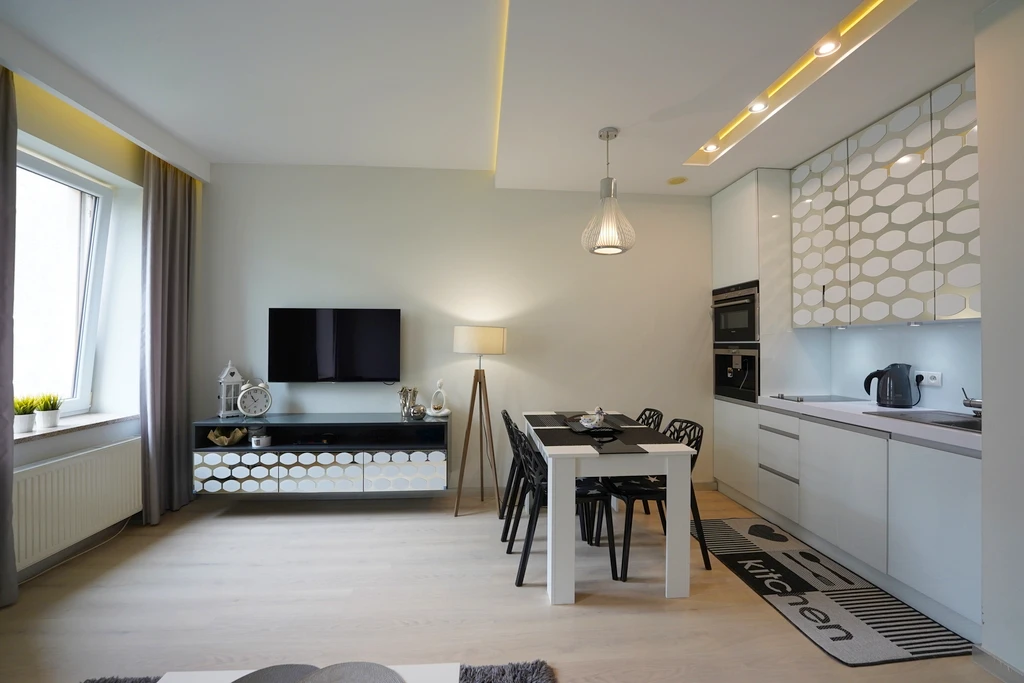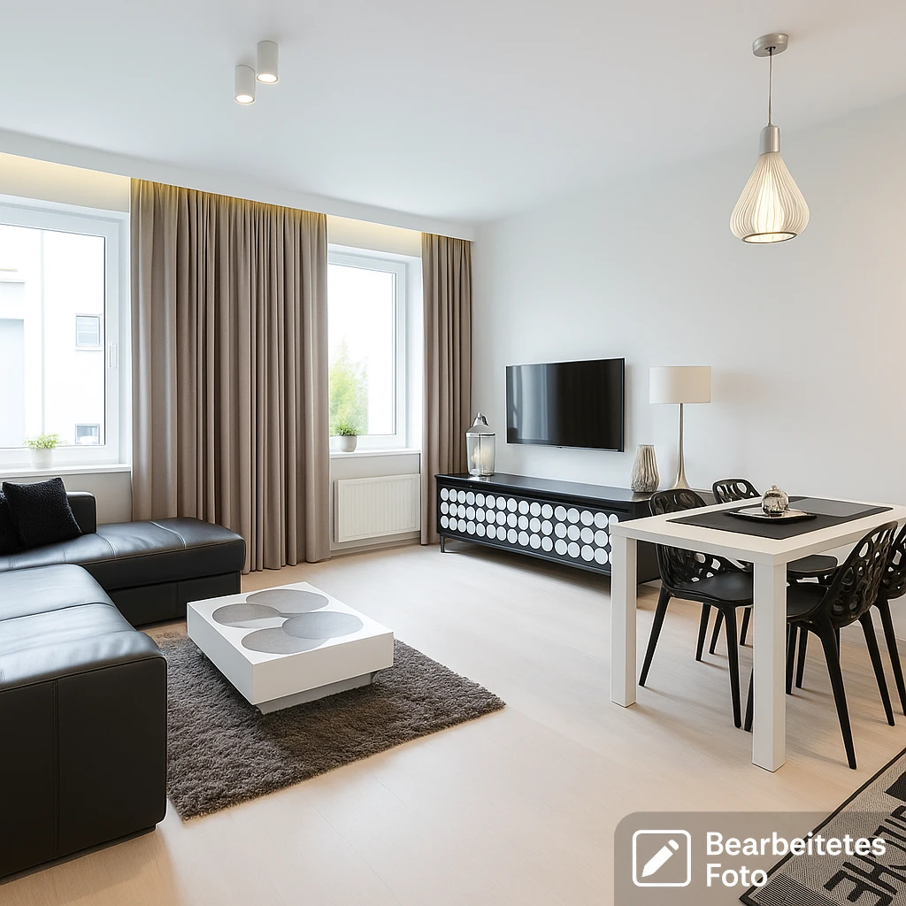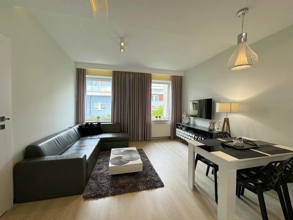 Die Wohnung wurde im modernen Stil eingerichtet und mit hochwertigen Materialien ausgestattet. Die offene Küche verfügt über einen Einbaubackofen sowie eine integrierte Kaffeemaschine der Marke Siemens – beides stilvoll in die Möblierung integriert.