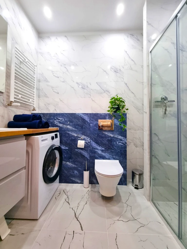 Badausstattung: Waschbecken, Dusche, Handtuchheizkörper, WC, Waschmaschine