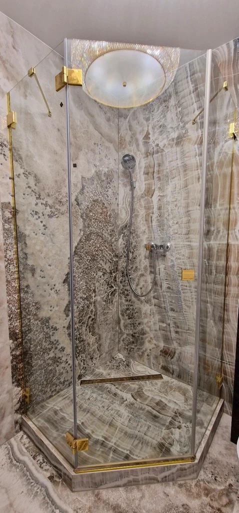 Im stilvollen Badezimmer wurden großformatige Feinsteinzeugfliesen ohne Fugen verwendet, was dem Raum eine klare, elegante Optik verleiht. Sanitärobjekte der Luxusmarke Villeroy & Boch sowie Armaturen von Hansgrohe unterstreichen die exklusive Ausstattung.