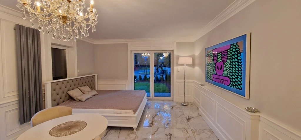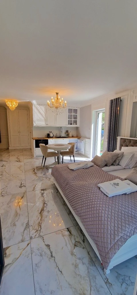 Das maßgefertigte, gepolsterte Kontinentalbett bietet höchsten Schlafkomfort. Italienische Designer-Kronleuchter verleihen den Räumen ein edles Ambiente. Die Küche überzeugt mit maßgefertigten, hochwertigen Möbeln und einer eleganten Holzarbeitsplatte. Geräte der renommierten Marke BOSCH sorgen für moderne Funktionalität.