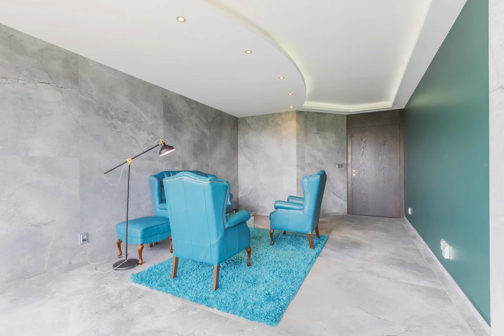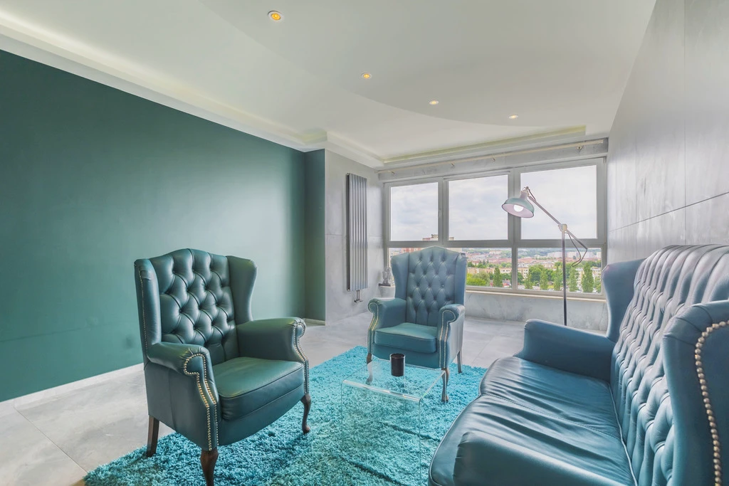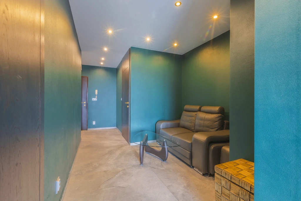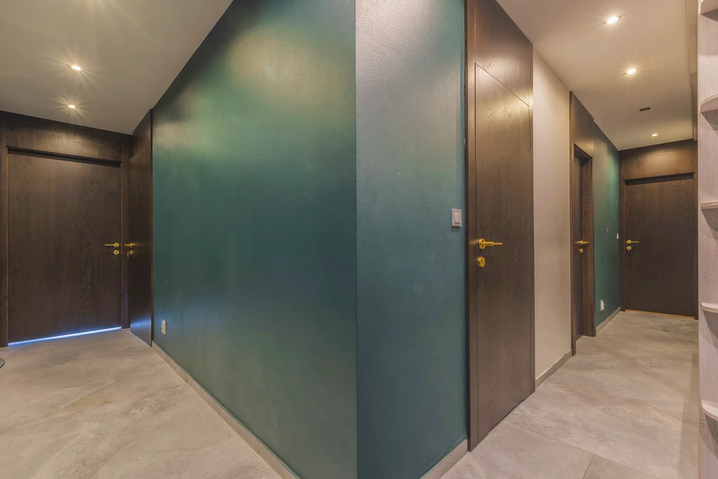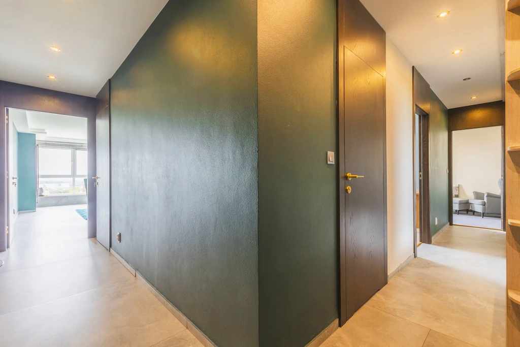 Schon beim Betreten beeindruckt das großzügige Wohnzimmer mit einer vollständig verglasten Wand und freier Sicht über die Skyline. Die Wände sind teils mit modernen Fliesen versehen, die perfekt mit dem durchdachten Bodendesign harmonieren. Jede Einbaulösung – ob Türen, Rahmen oder Schränke – wurde nach Maß gefertigt. Edle Holztüren reichen bis zur Decke und unterstreichen die hohe Qualität und das elegante Raumgefühl.