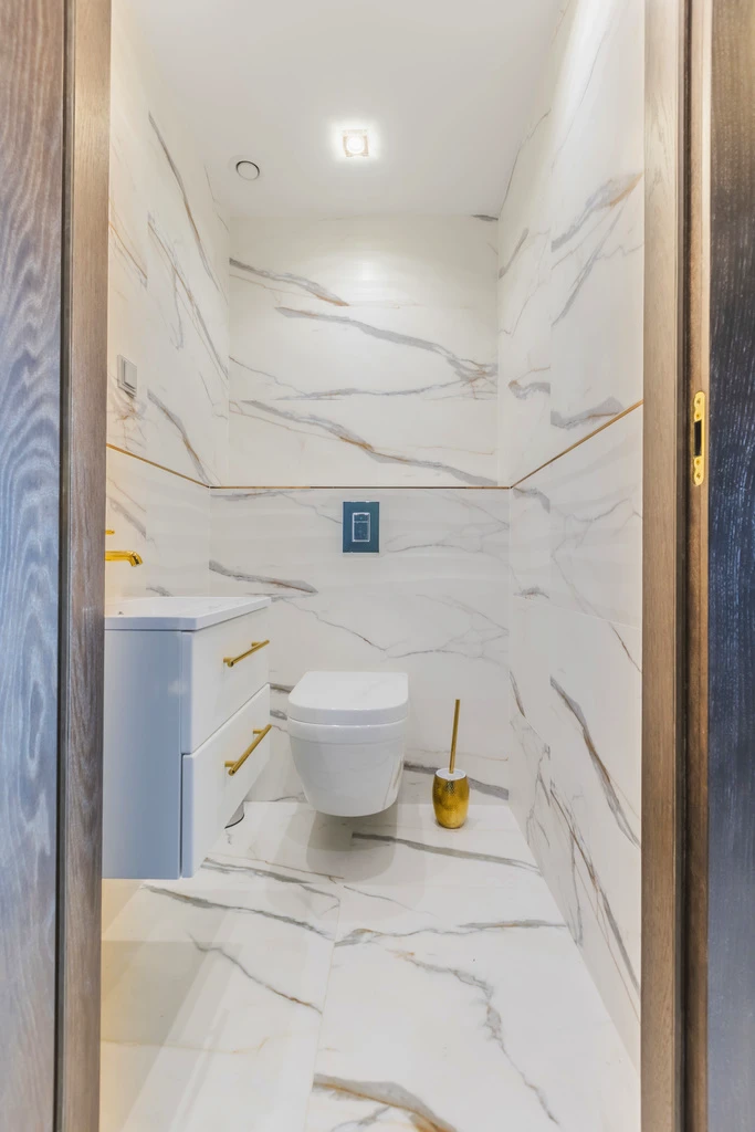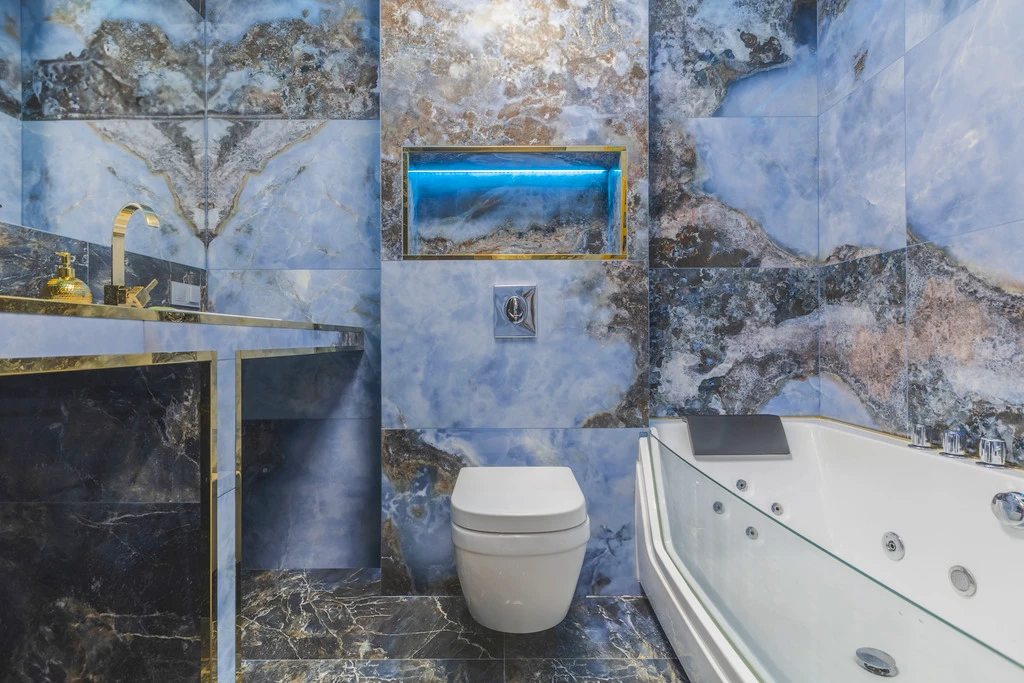 Das Badezimmer wurde mit eleganten Materialien ausgestattet und verfügt über eine Toilette, Waschtisch sowie eine Whirlpool-Badewanne. Zusätzlich steht ein separates Gäste-WC zur Verfügung – ideal für Besuch oder die berufliche Nutzung der Räumlichkeiten.