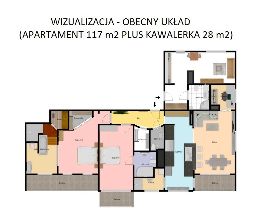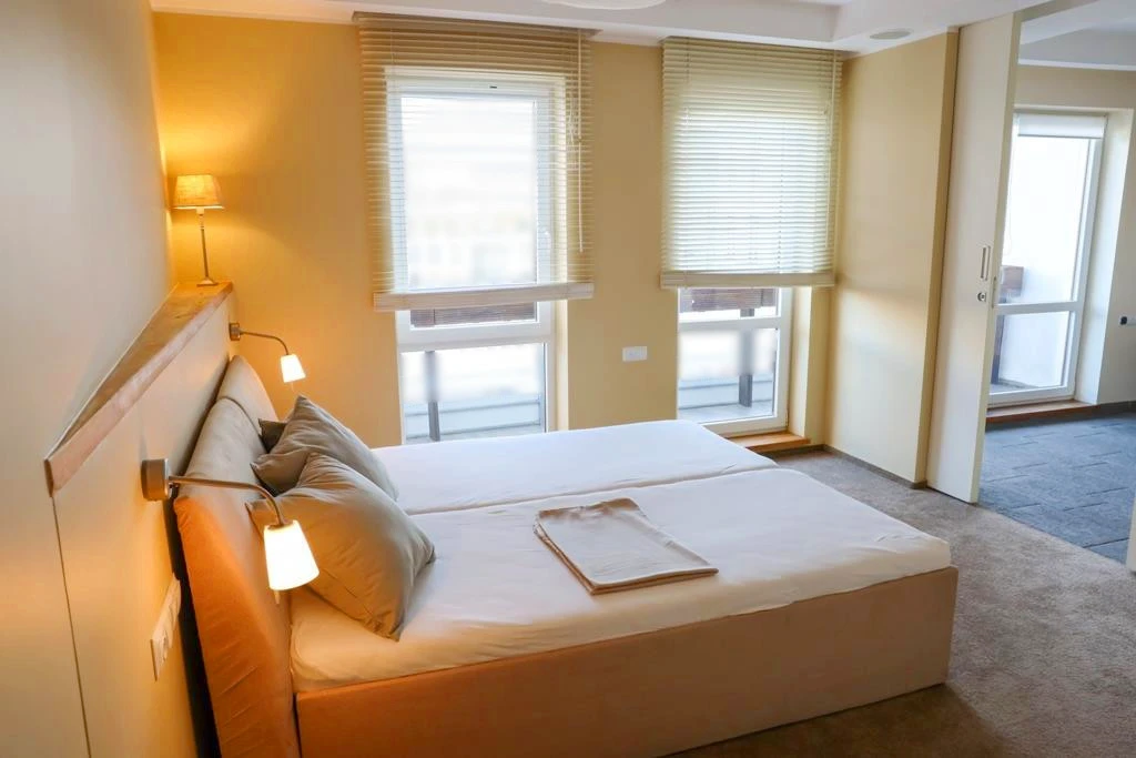 Zum Angebot gehört ein Hauptapartment mit 117 m² sowie ein angrenzendes Studio-Apartment mit 28 m². Beide Einheiten sind durch eine Trennwand verbunden, die – auf Wunsch – entfernt werden kann. So entsteht ein großzügiger Wohnraum mit vielseitigen Gestaltungsmöglichkeiten, einem zusätzlichen Schlafzimmer oder einer separaten Gästewohnung.