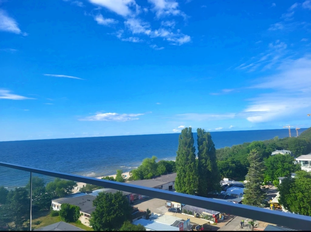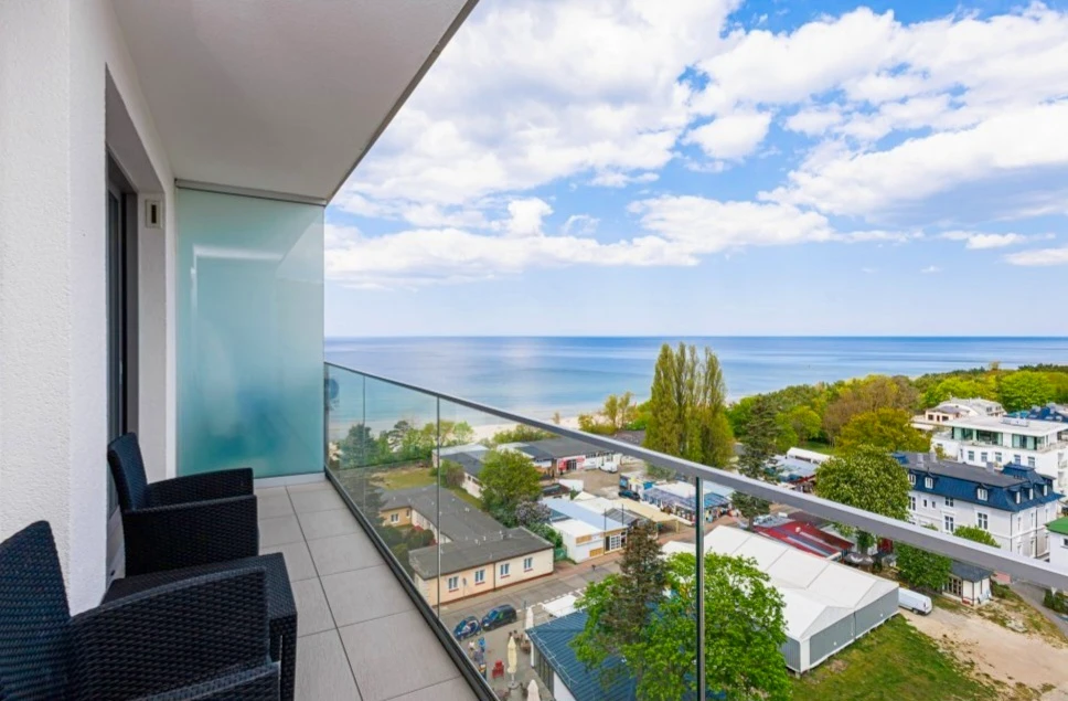 Wohnzimmer mit Küchenzeile, Schlafzimmer, Badezimmer und Balkon mit Ausblick auf die Ostsee.