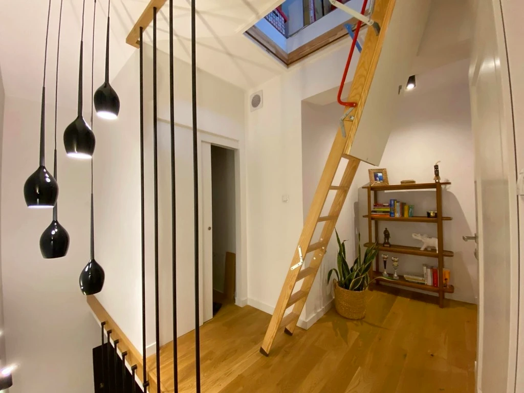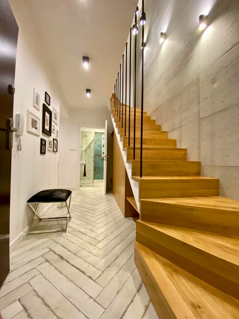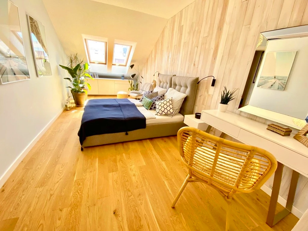Die Räumlichkeiten sind stilvoll und mit viel Liebe zum Detail gestaltet. Hochwertige Materialien wie maßangefertigtes italienisches und spanisches Parkett sowie dekorativer Strukturbeton an den Wänden unterstreichen den modernen Charakter der Wohnung und bieten höchsten Wohnkomfort.