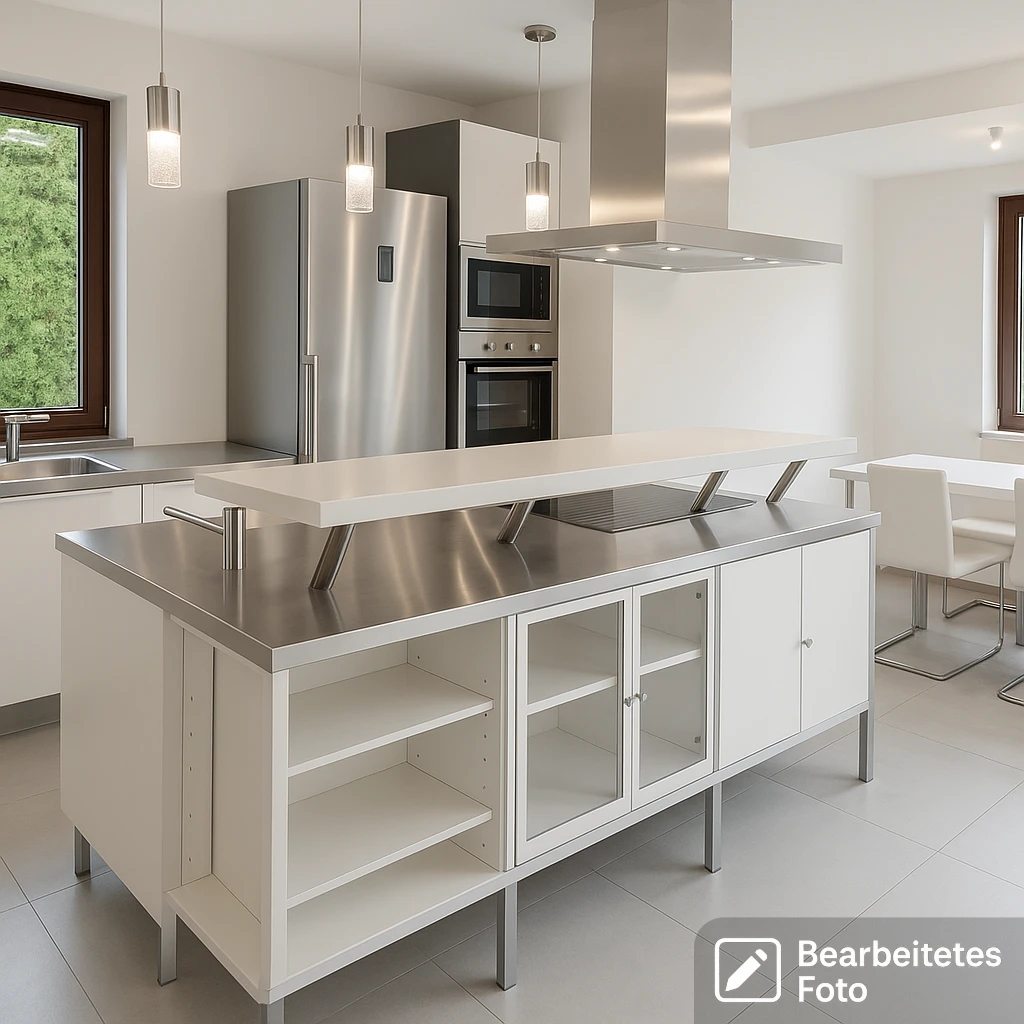 Das Herzstück des Hauses bildet der großzügige Wohnbereich mit offenem Kamin, Küche und Essbereich – insgesamt ca. 55 m². Die helle, offene Küche ist mit hochwertigen Einbaugeräten der Marken Bosch und Siemens ausgestattet, darunter Kühlschrank mit Gefrierfach, 60 cm Geschirrspüler, Cerankochfeld, Backofen und Mikrowelle.