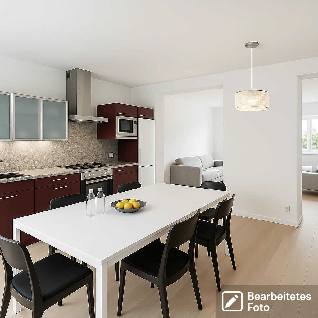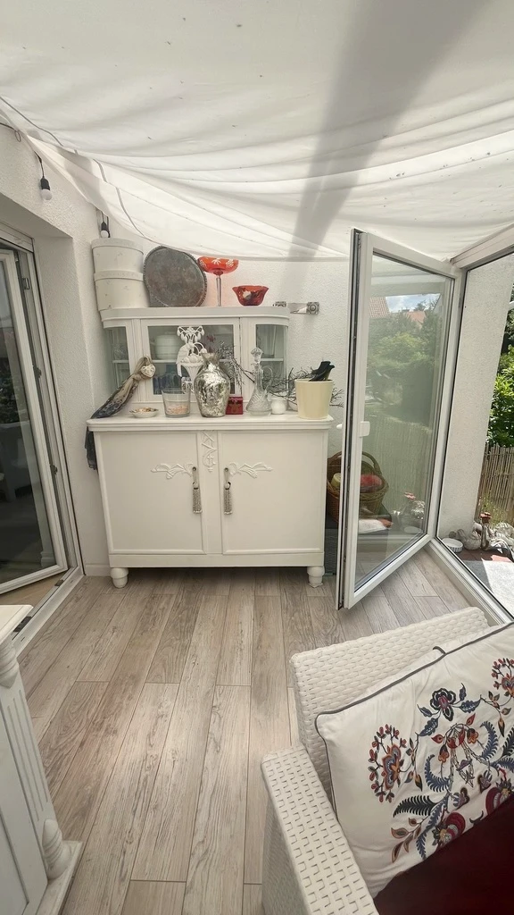 Großzügige Küche mit Essbereich, teilweise offen gestaltet zum hellen Wohnzimmer mit Kaminofen. Von hier aus Zugang zum gemütlichen Wintergarten mit Blick ins Grüne. In der Küche bleibt die maßgefertigte Einbauküche samt moderner Geräte erhalten. Granitarbeitsplatten und stilvolle, glasierten Feinsteinzeugfliesen schaffen ein hochwertiges Ambiente. Angenehme Fußbodenheizung sorgt für Komfort.