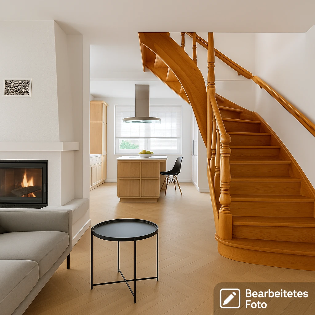 - Ein großzügiger, lichtdurchfluteter Wohnbereich mit Kamin und offener Raumgestaltung