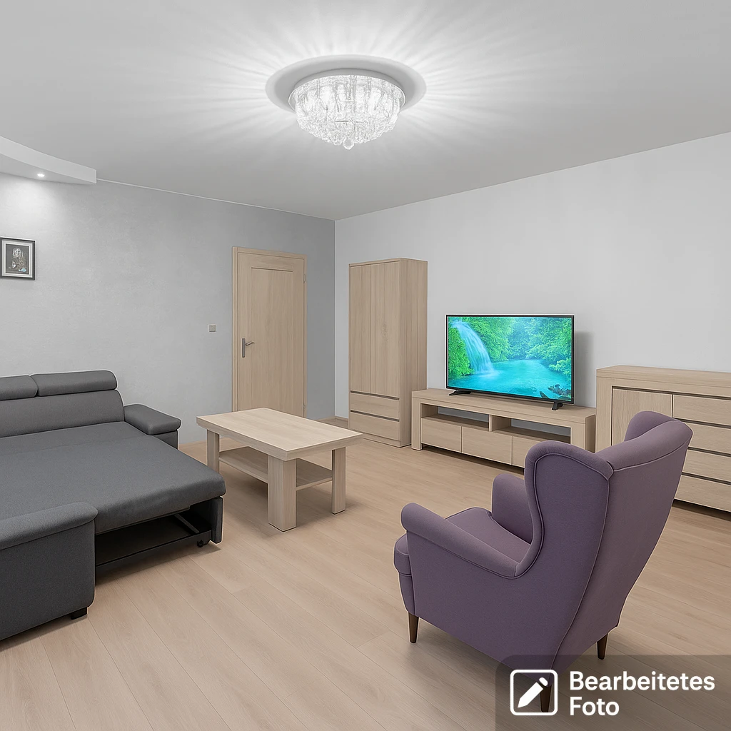 - Die Wohnung wird inklusive Möblierung verkauft – in jedem Zimmer bleiben Möbel sowie je ein 55-Zoll-Fernseher.
