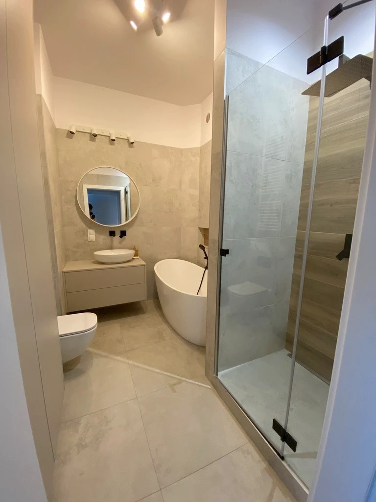 - Ausstattung: Badewanne, Duschkabine, Waschbecken, Handtuchheizkörper, Waschmaschine