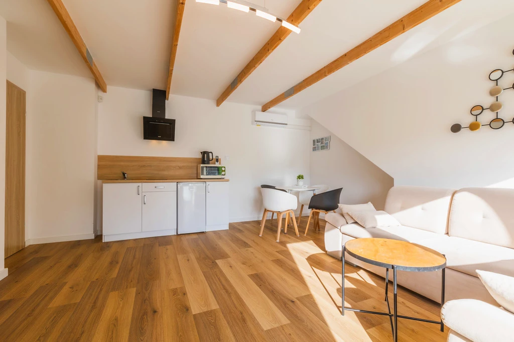 - Zwei großzügige Apartments mit separatem Schlafzimmer, Wohnzimmer mit Küchenzeile und Badezimmer