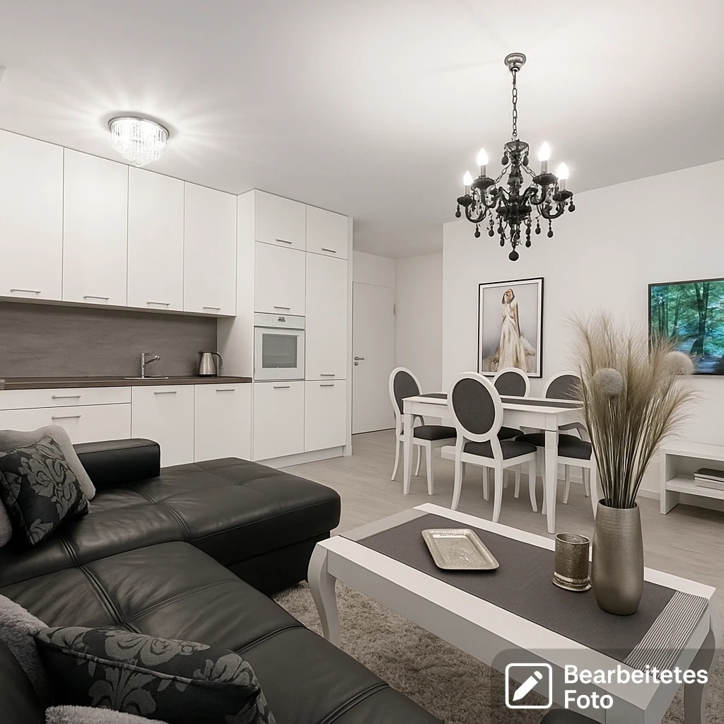 - Hochwertige Haushaltsgeräte: Kühlschrank mit Gefrierfach, Backofen, Induktionskochfeld, Dunstabzugshaube, Geschirrspüler