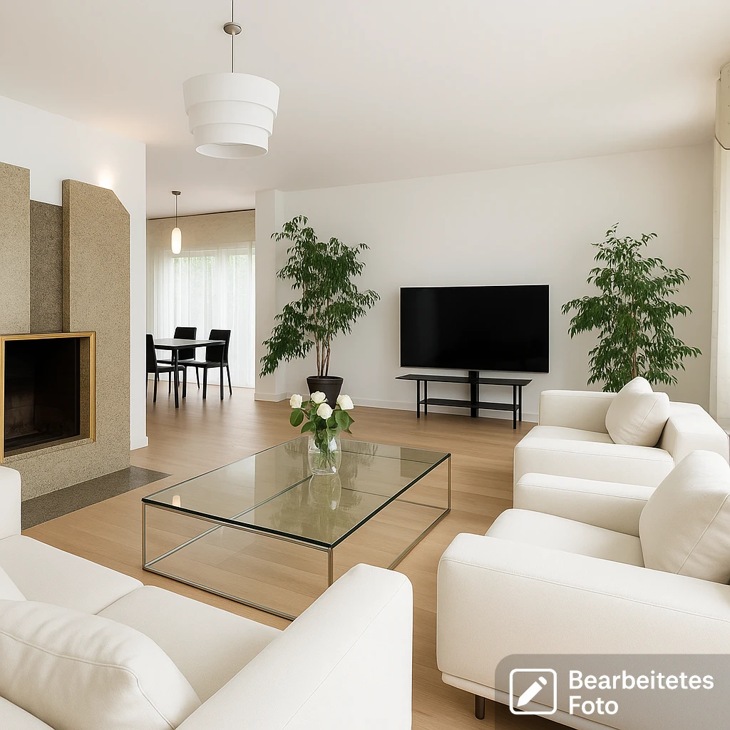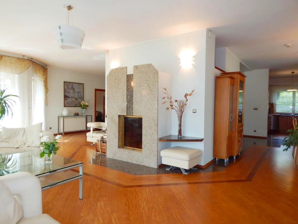 - Großzügiger Wohnbereich mit gemütlichem Kamin, offener Gestaltung zur Essecke und Zugang zu zwei sonnigen Terrassen