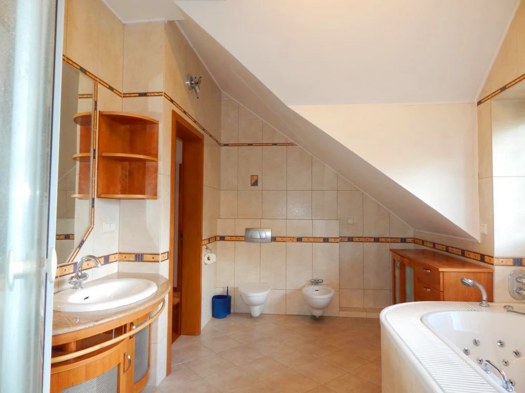 - Großes Wellnessbad mit Whirlpool-Badewanne, Dusche mit Massagedüsen, WC und Bidet