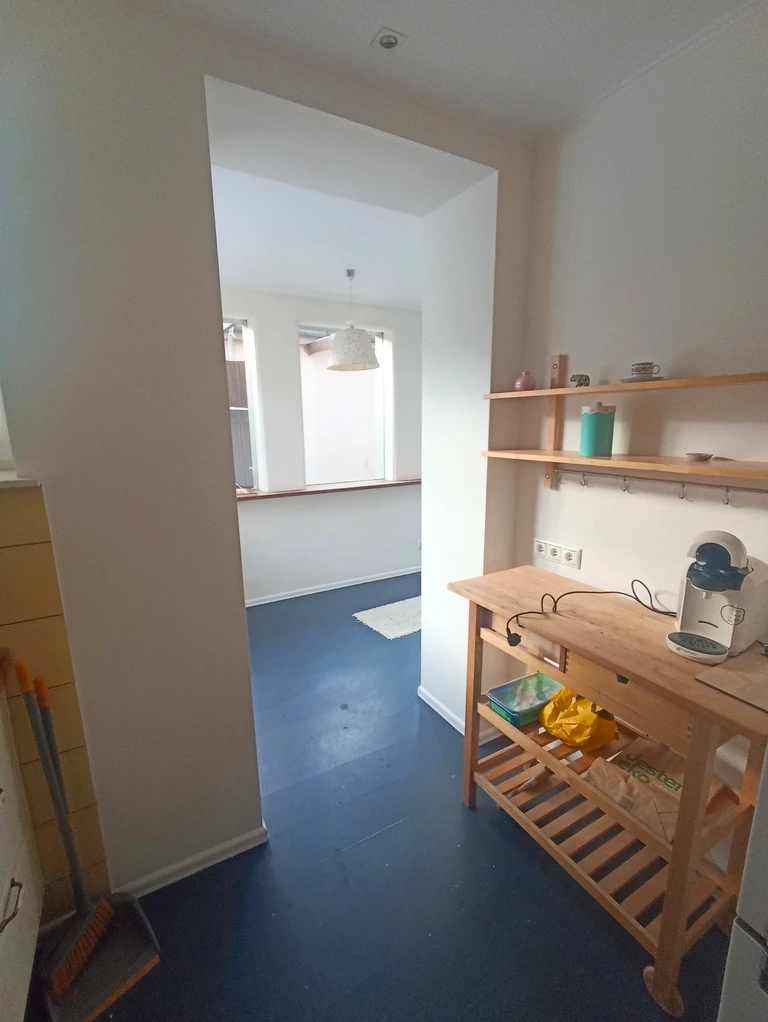 Großzügiger Flur, Wohnzimmer mit integrierter Küche (kann auf Wunsch in ein separates Zimmer rückgebaut werden), Schlafzimmer mit Einbauschrank, Badezimmer mit Dusche und WC