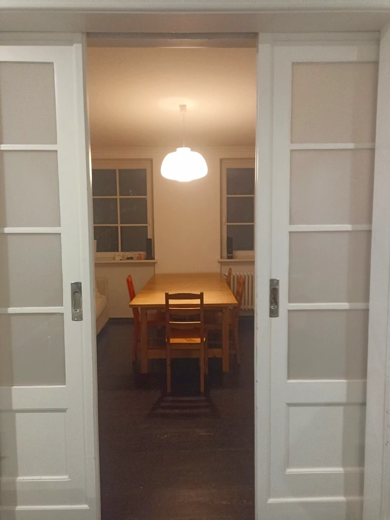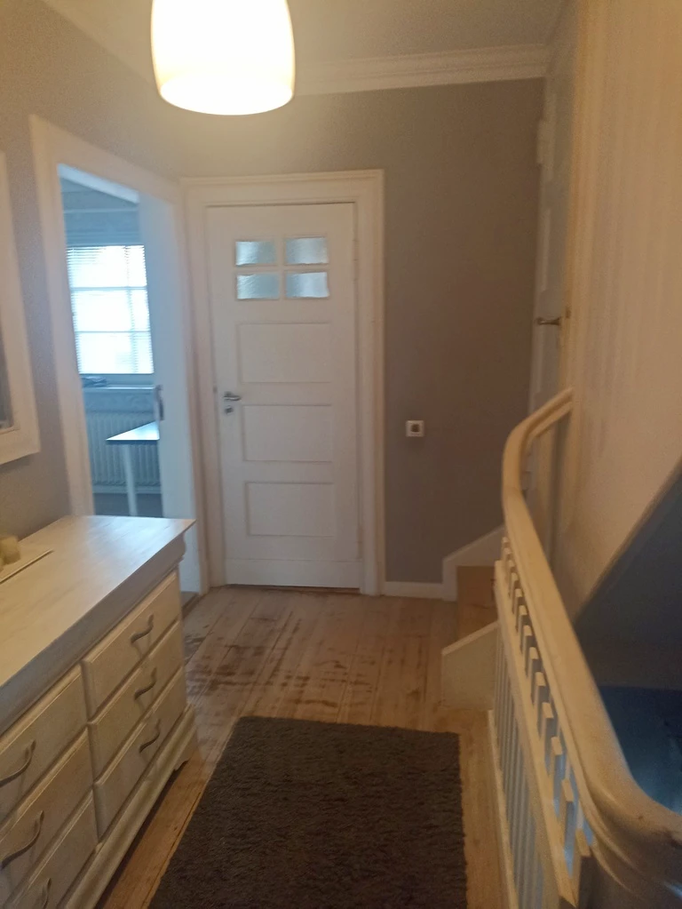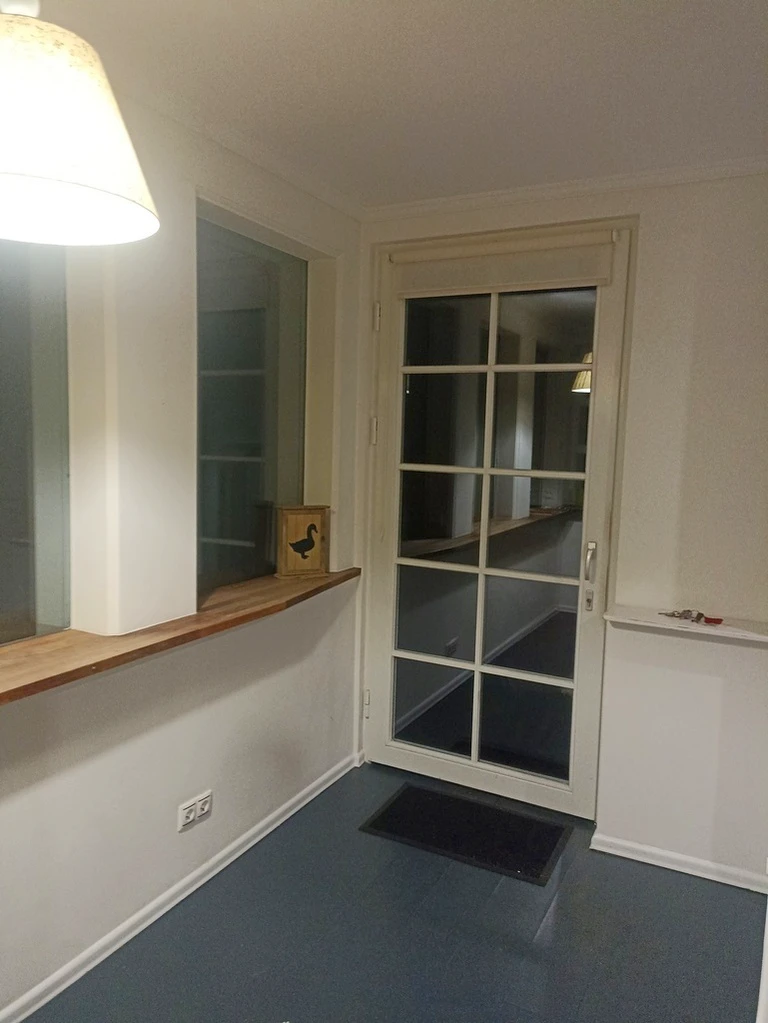 - Zugang vom Garten: Veranda, Wohnzimmer, verbundenes Durchgangszimmer mit Schiebetür, Küche, Badezimmer mit Badewanne und WC