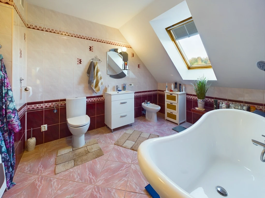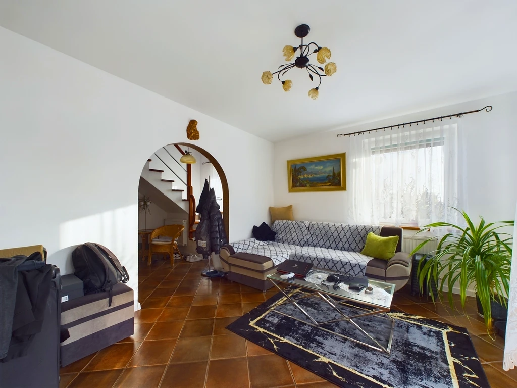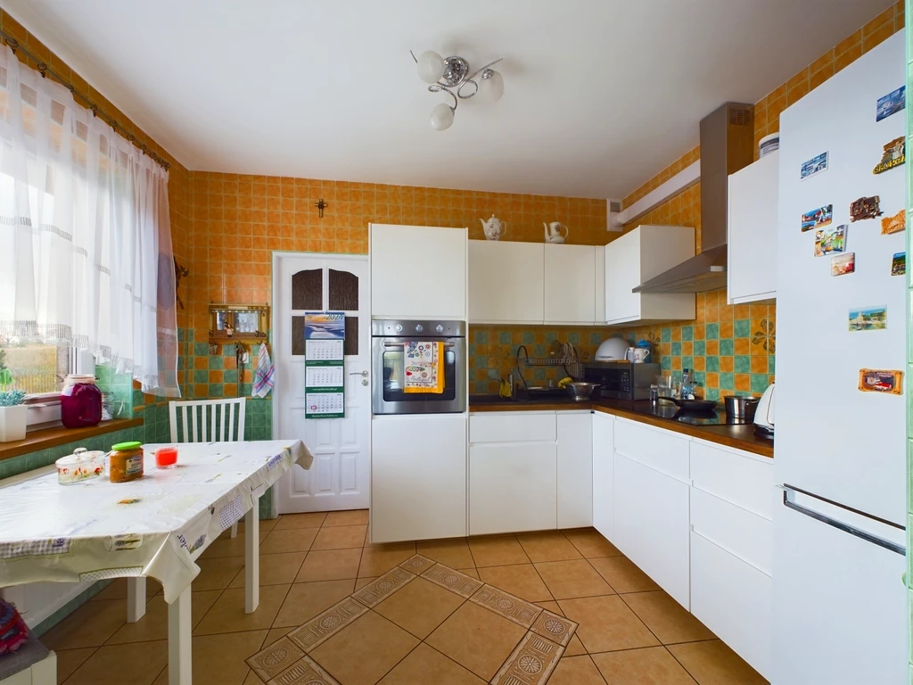 Die Kombination aus modernen Kunststofffenstern, hochwertigen Bodenbelägen (Fliesen und Laminat), und soliden Baumaterialien (Steinblockwände, Ziegeldach) verleiht dem Haus eine angenehme Wohnqualität.