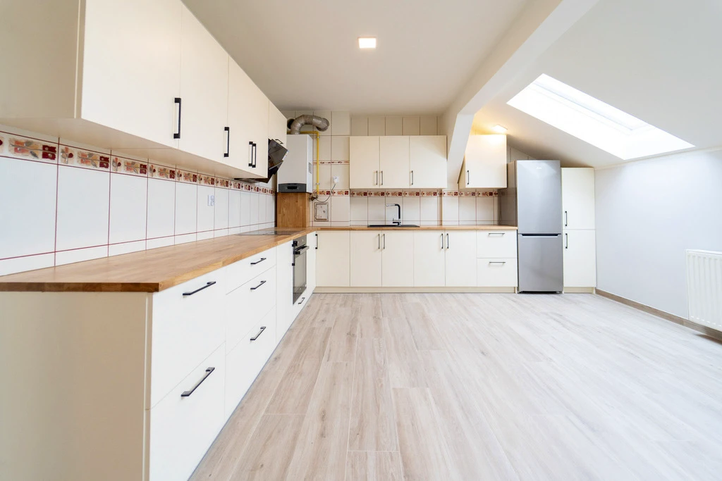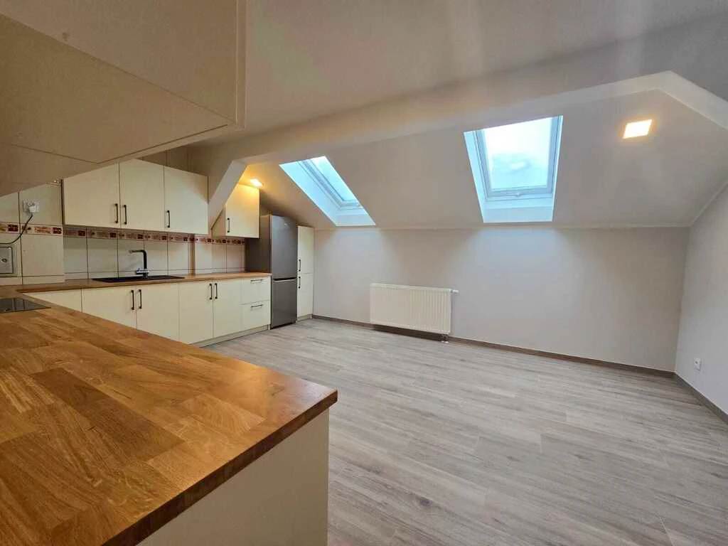 Die neue Küche ist mit stilvollen Einbaumöbeln und modernen Haushaltsgeräten ausgestattet. Helle Fliesen und Laminatböden schaffen ein harmonisches Gesamtbild.