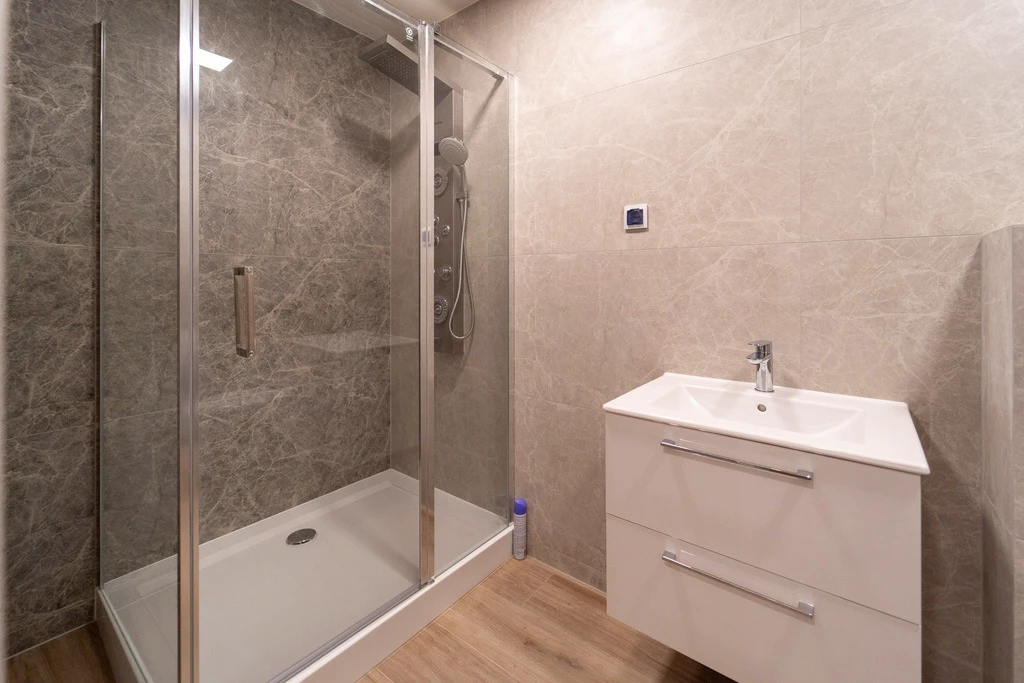 Das Badezimmer verfügt über eine Hydromassage-Dusche, ein modernes WC, ein Waschbecken sowie eine Waschmaschine.
