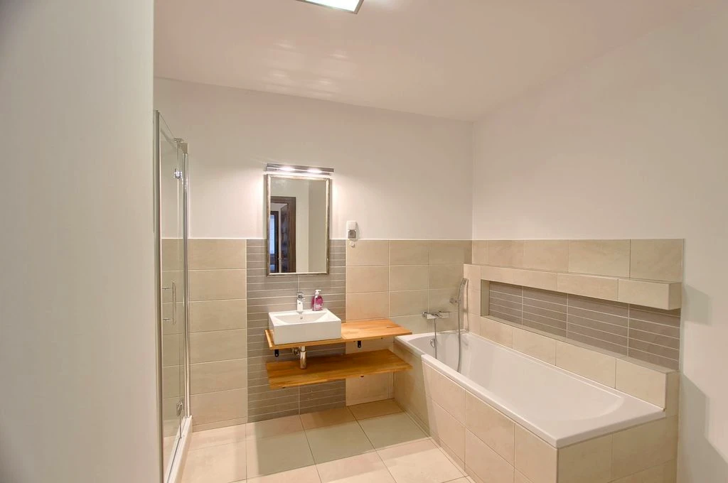 - Untere Ebene: Zwei Zimmer, eine voll ausgestattete Küche mit Möbeln und Elektrogeräten, ein modernes Bad sowie ein Hauswirtschaftsraum.