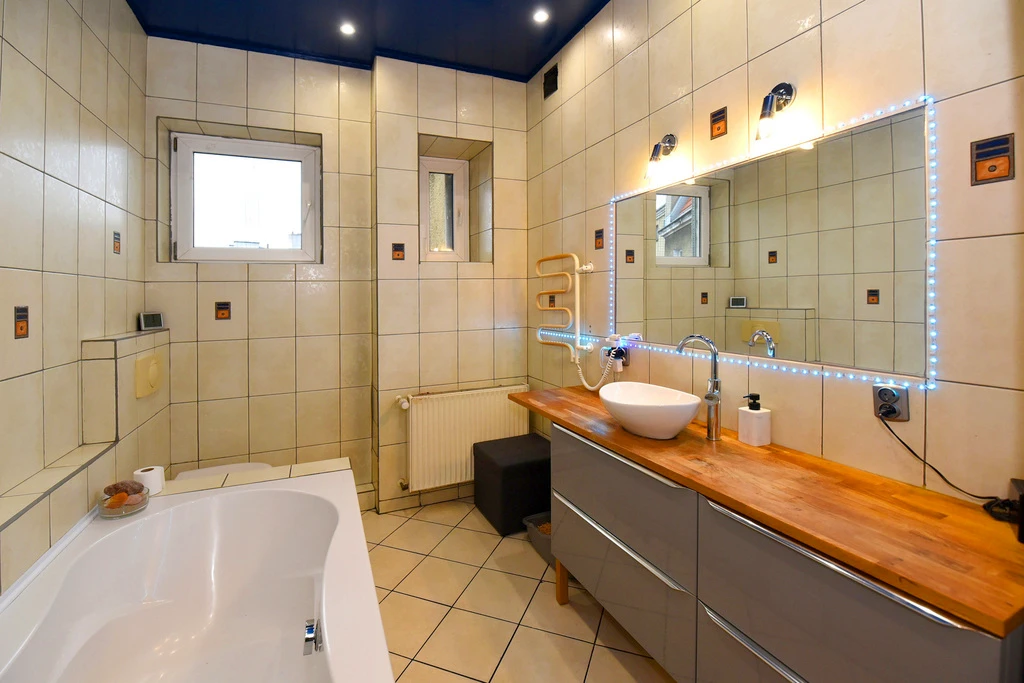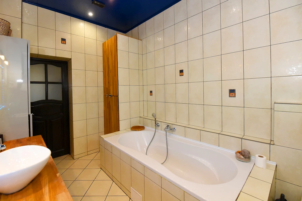 Das Badezimmer ist mit einer Badewanne und einem WC ausgestattet. Die Gestaltung wurde mit Blick auf Komfort und Funktionalität gewählt, um ein harmonisches Raumgefühl zu schaffen.