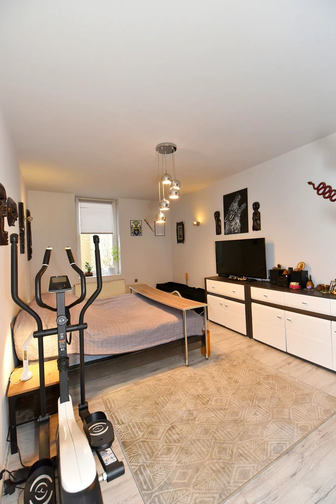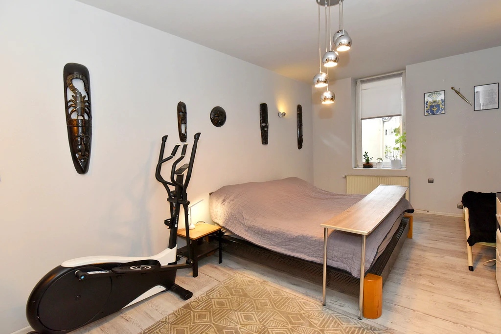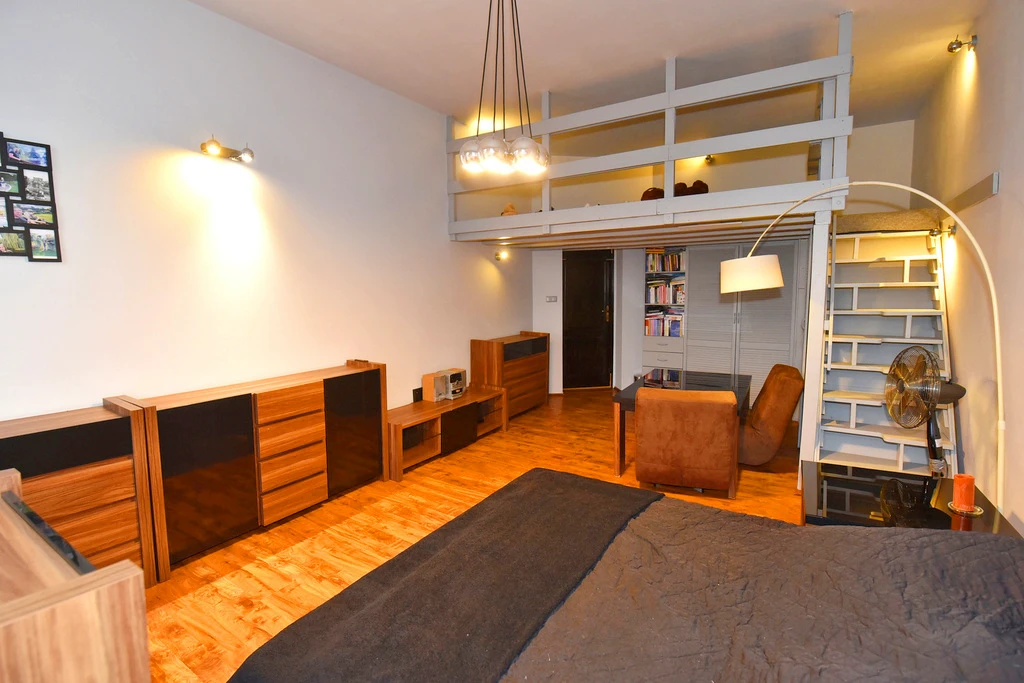 Unterhalb der Mezzanine befindet sich ein gemütlicher Schlafbereich mit einem geräumigen, maßgeschneiderten Einbauschrank. Dies erlaubt nicht nur bequeme Nutzung des Raumes, sondern auch optimale Aufbewahrungslösungen.