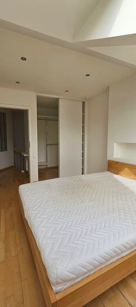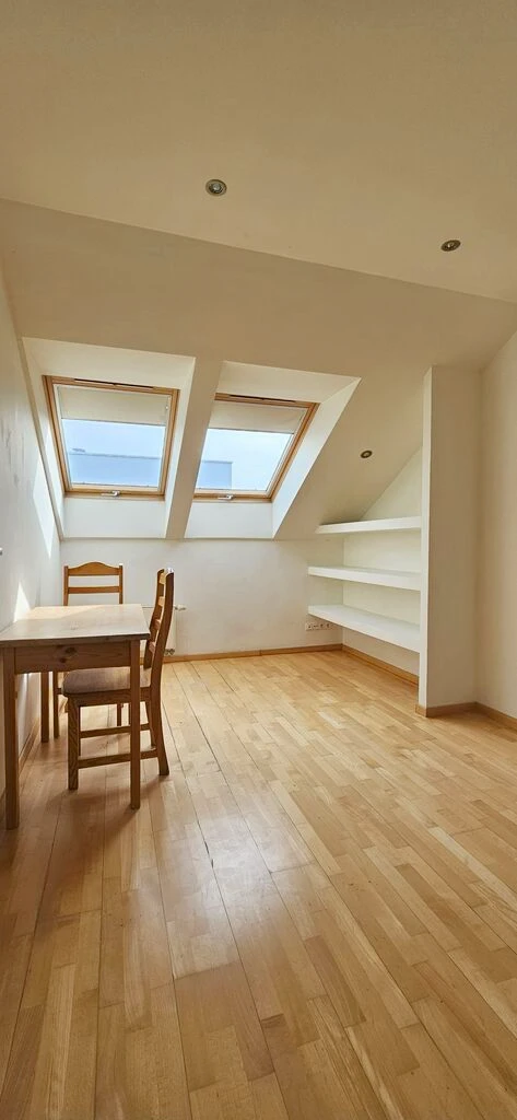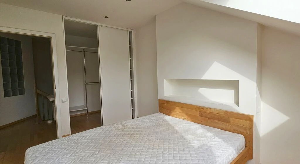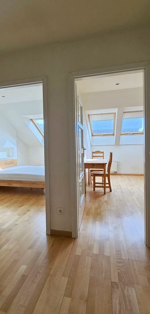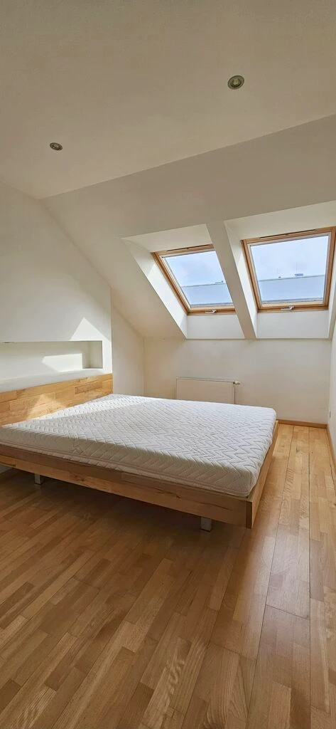 - Zwei Schlafzimmer mit gemütlichen Dachschrägen. Eines der Zimmer verfügt über Regalgieße aus Rigips, im anderen befindet sich ein Bett mit Matratze.