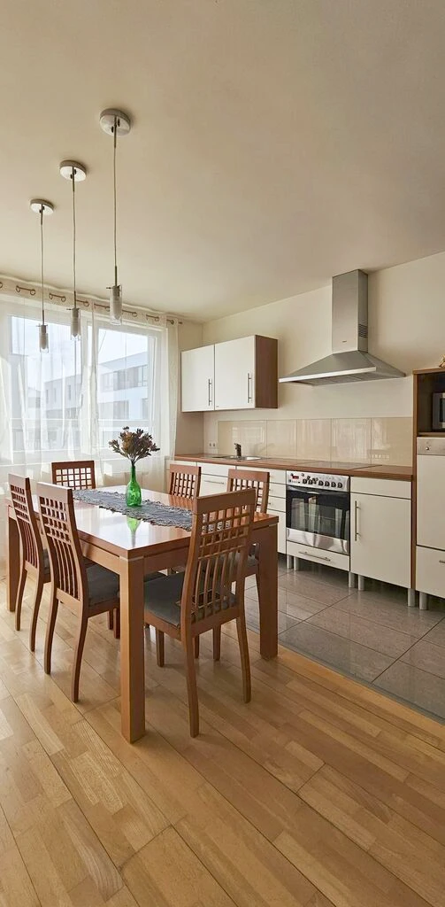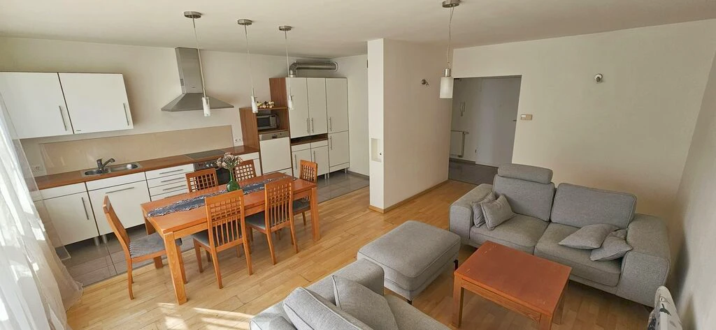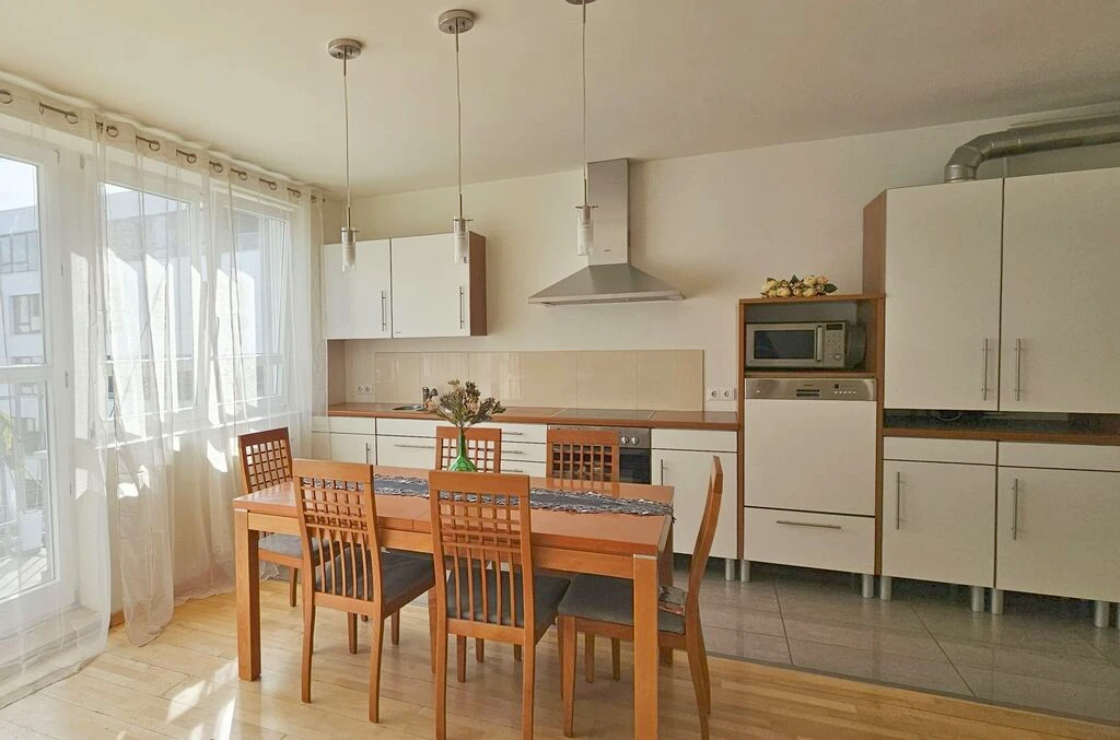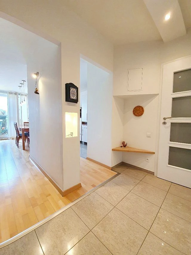 - Die Böden bestehen aus hochwertigem Barlinek-Holzparkett, in Küche und Bad aus glasiertem Feinsteinzeug.