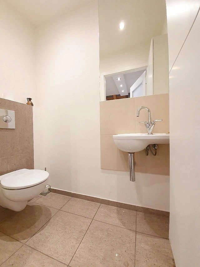 - Separates Gäste-WC mit praktischen Einbauschränken.