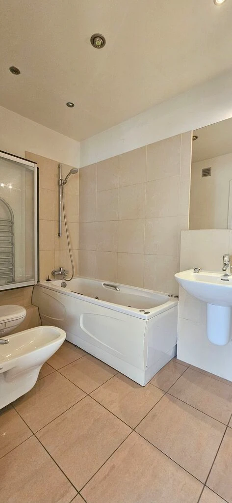 - Modernes Badezimmer mit Whirlpool-Badewanne, Bidet, WC sowie einer Wasch-Trocken-Kombination. Fußbodenheizung sorgt für zusätzlichen Komfort.