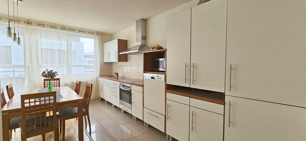 - In einer großen Nische befindet sich praktischer Stauraum mit Einbauschränken, ideal für Haushaltsgeräte oder Waschmaschine.
