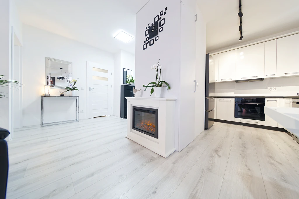- Moderne Einrichtung mit eleganten Akzenten wie dem Elektrokamin.