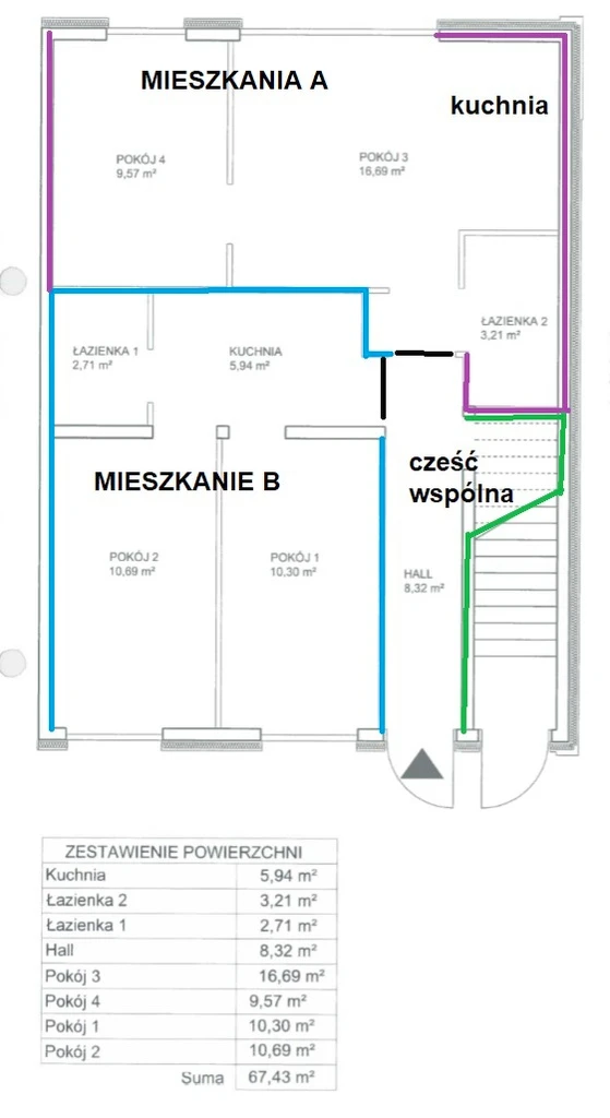 Die Gesamtwohnfläche beträgt ca. 67,43 m². Auf Wunsch besteht die Möglichkeit, die ursprüngliche 4-Zimmer-Aufteilung gegen einen Aufpreis von €930 (PLN 4.000) wiederherzustellen (inkl. Rückbau der Küche, Entfernung der Eingangstüren sowie Nachbearbeitung der Türrahmen).
