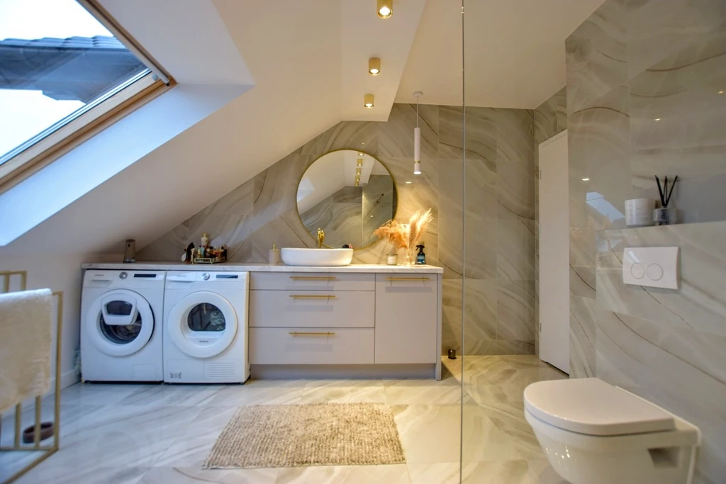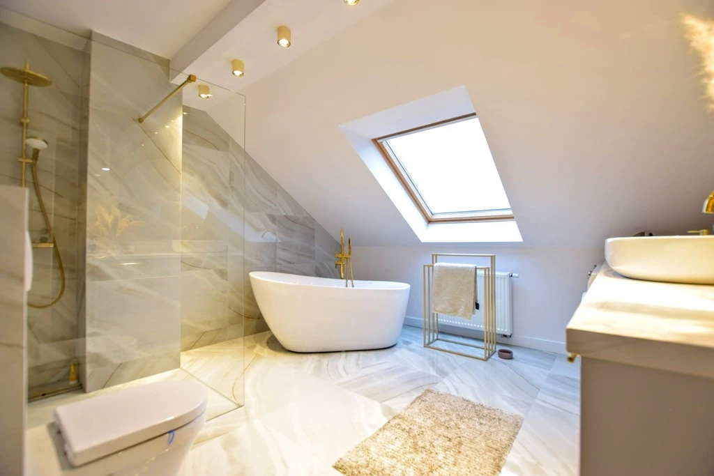 - Zwei moderne Badezimmer – eines mit Dusche, das andere mit freistehender Badewanne und zusätzlicher Dusche