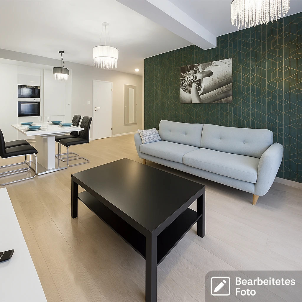 Heller, offener Wohnbereich mit modernem, voll ausgestattetem Küchenbereich – Kombination aus Funktionalität und zeitlosem Design.
